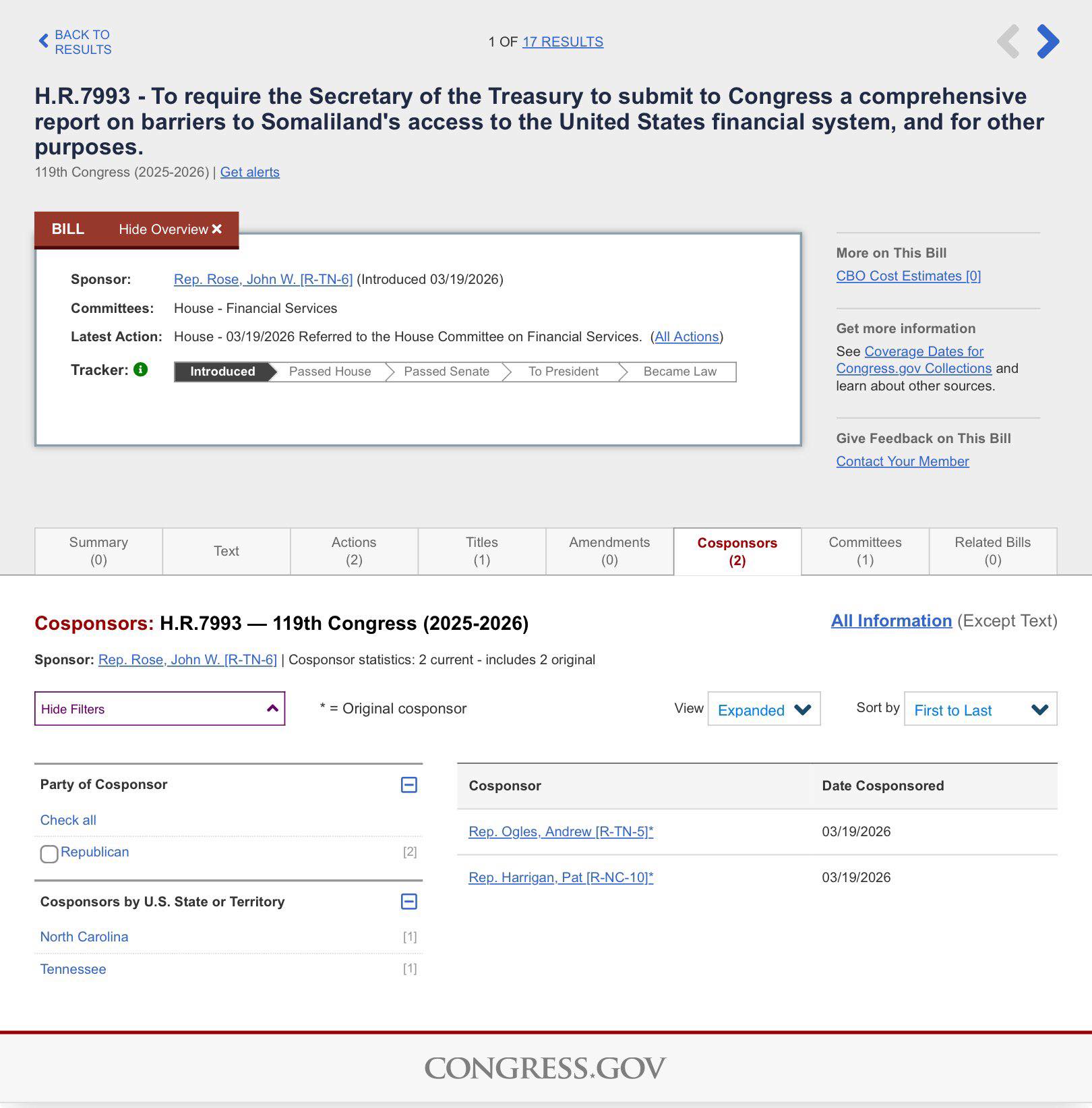 ويحمل مشروع القانون رقم H.R. 7993 اسم قانون الوصول الاقتصادي والفرص لصوماليلاند، وقد قدّمه النائب جون روز، بدعم مشترك من النائبين بات هاريغان وأندرو أوغلس، وفقًا لسجلات الكونغرس.